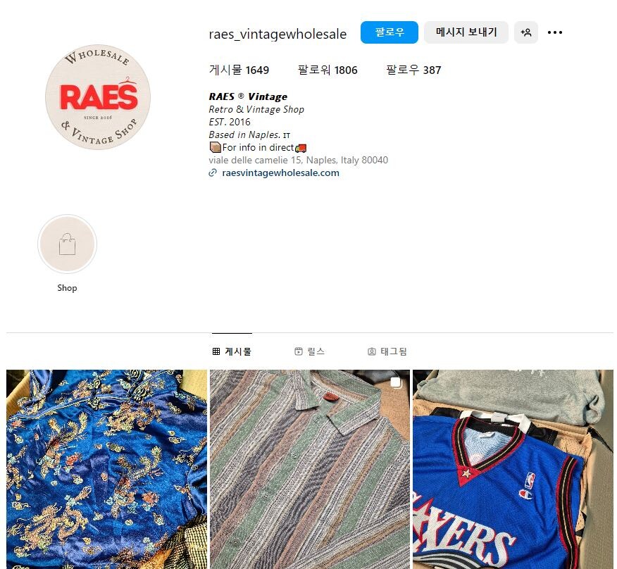 - 인스타그램https://www.instagram.com/raes_vintagewholesale/shopify- 인스타그램을 통해 물건스타일을 확인하실 수 있습니다.