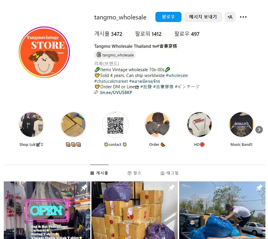 - 인스타그램 https://www.instagram.com/tangmo_wholesale/- 인스타그램을 통해 물건스타일을 확인하실 수 있습니다.